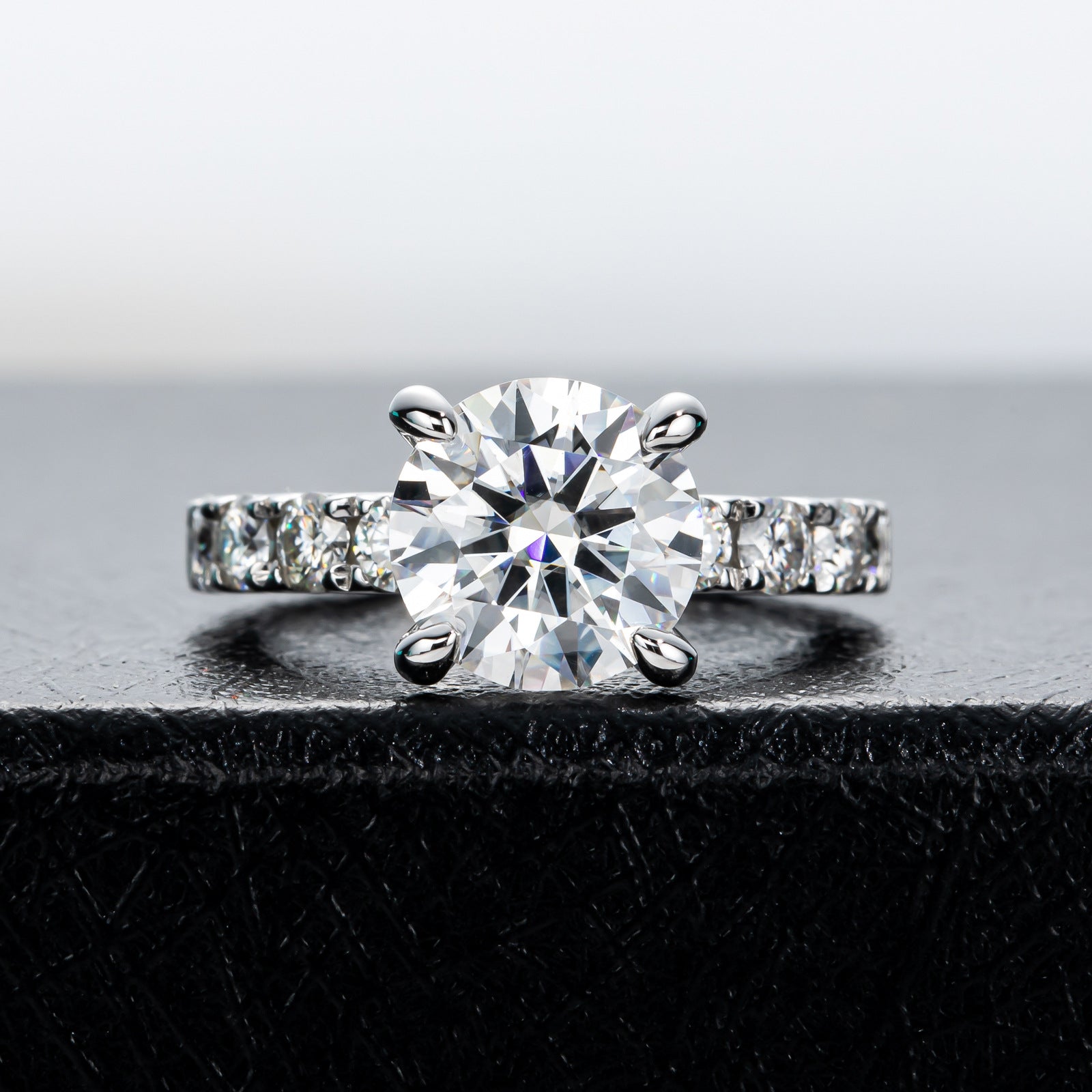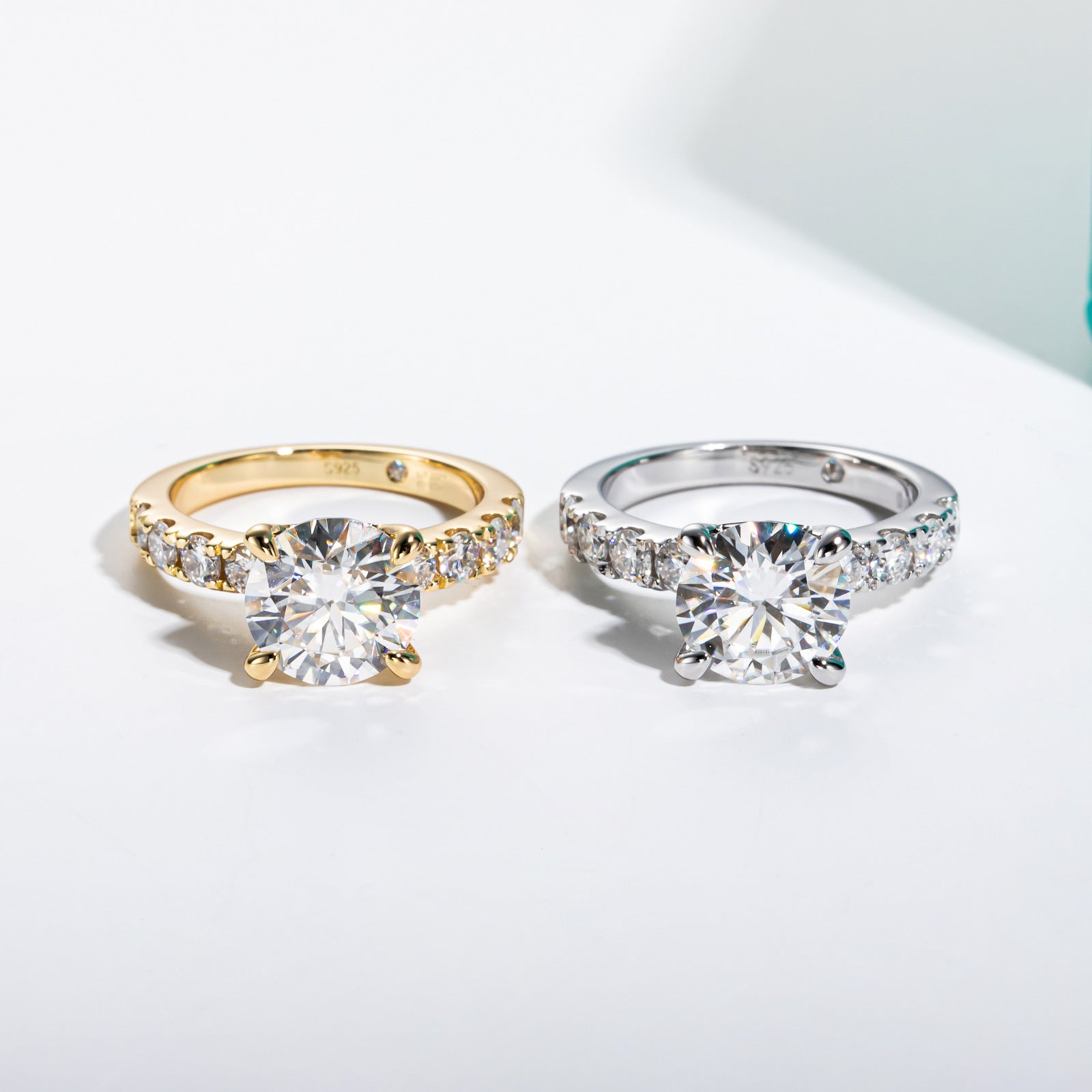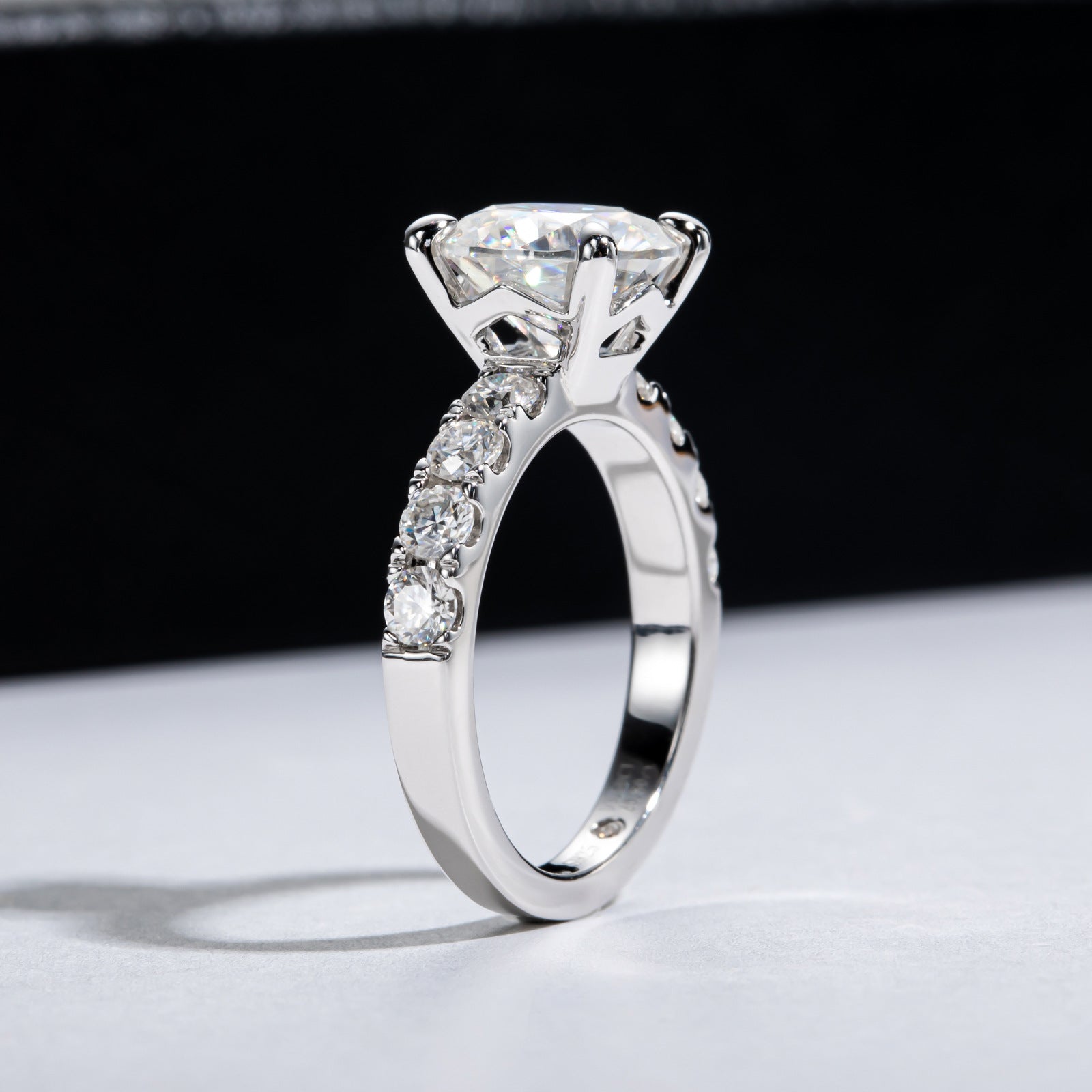 The Sofia Solitaire showcases a brilliant moissanite center stone, elegantly complemented by delicate round diamonds on each side. This refined design offers timeless sophistication and a subtle sparkle, perfect for those who appreciate understated luxury.